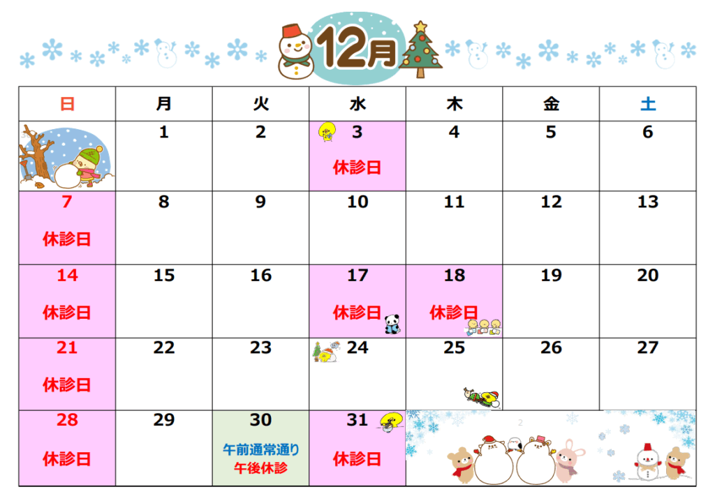 12月の診療カレンダーができましたので、お知らせいたします⛄