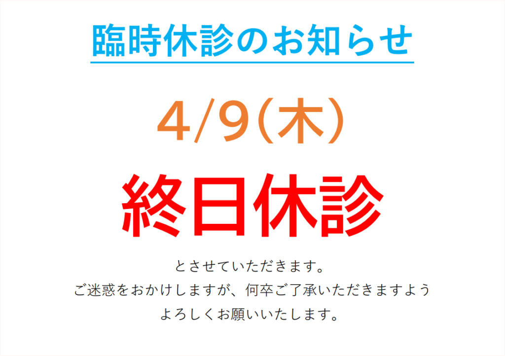 2026/04/08 こんにちは!イルカ動物病院です🐬🏥 明日(4/9)は終日休診となります。4/10~は通常通り診療いたします。ご迷惑をおかけいたしますが、何卒ご了承いただきますようよろしくお願いいたします。